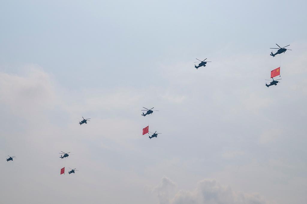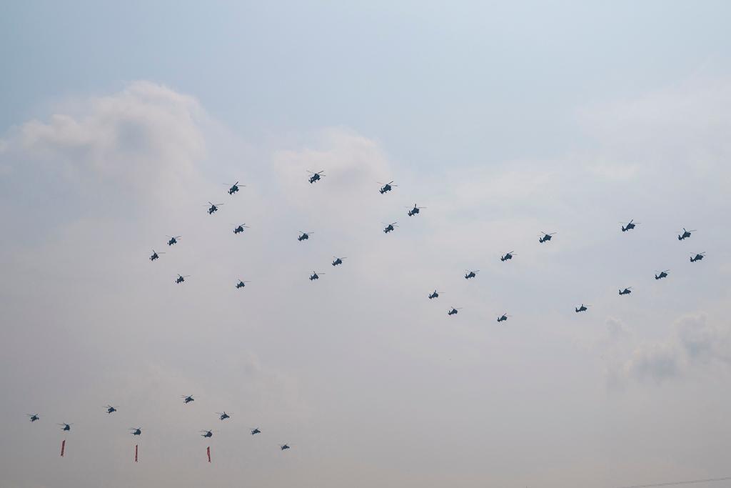 9月3日,纪念中国人民抗日战争暨世界反法西斯战争胜利80周年大会在北京隆重举行。图为空中护旗梯队接受检阅。