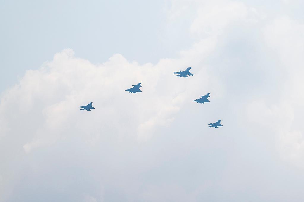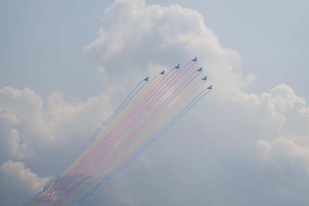 9月3日,纪念中国人民抗日战争暨世界反法西斯战争胜利80周年大会在北京隆重举行。图为歼击机梯队接受检阅。