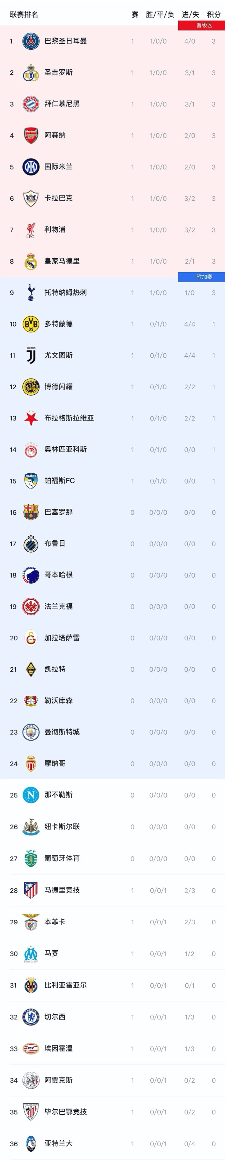 至此,在欧冠积分榜上,同积3分的有9支球队,按净胜球优势排行,前五名分别是巴黎、圣吉罗斯、拜仁、阿森纳、国米。
