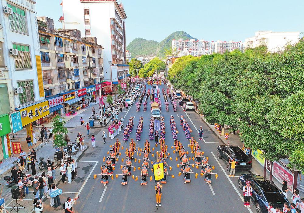 本次活动以侬峒文化为纽带,打造多元沉浸式体验场景。由铜鼓方阵、图腾方阵及各乡镇特色方阵组成的民俗巡游队伍,生动展现大新深厚的文化底蕴;非遗展区集中呈现宝圩壮族服饰、壮锦技艺等传统工艺的当代生命力。而融合中越特色的长桌宴更以簸箕为席、芭蕉叶为盘,汇聚当地经典美食,成为边民情感交融、文化互鉴的生动平台。