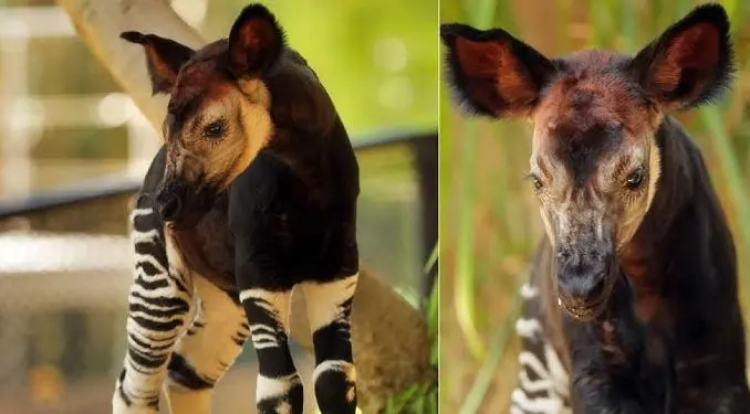 美国动物园诞生一只的濒危霍加狓你可能叫不出名字,但你一定知道这个物种,它们的外形实在太“缝合怪”了,以至于拿这个物种当作题材的文章和视频都不少。远看其像是斑马,但是黑白的条纹似乎只集中在腿部,身体则是深褐色的;其体态更粗短,不似斑马那般修长;再看头部,显然就不是“马”,倒更像长颈鹿,头顶还有一对短短的角。